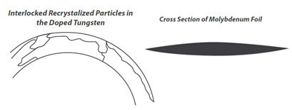 Este alambre de tungsteno especialmente hecho hace que sea posible la producción de filamentos que son la distorsión libre (que no se descuelgue) y tienen una larga vida útil. Conocido como tungsteno dopado, este filamento resistente al pandeo es en el K₂O-SiO₂-Al₂O₃ de la familia